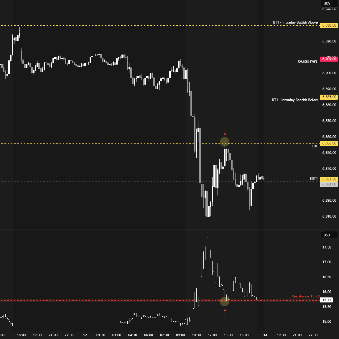 As discussed in Friday’s Plan, the 6905 and 6909 levels were pivotal to observe in order to gauge the market’s strength or weakness. Buyers ultimately failed to maintain 6909, triggering notable weakness that cleared and exceeded all intraday downside targets. Note the significant confluence with Friday’s afternoon rally high, which tagged the FDT 6856 almost to the tick, with the VIX retesting its broken resistance from above (see Figure 1).