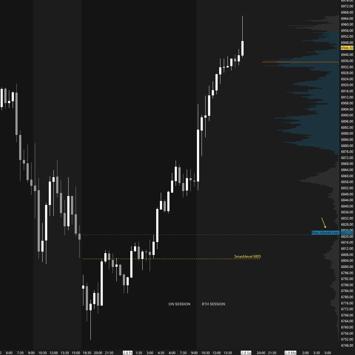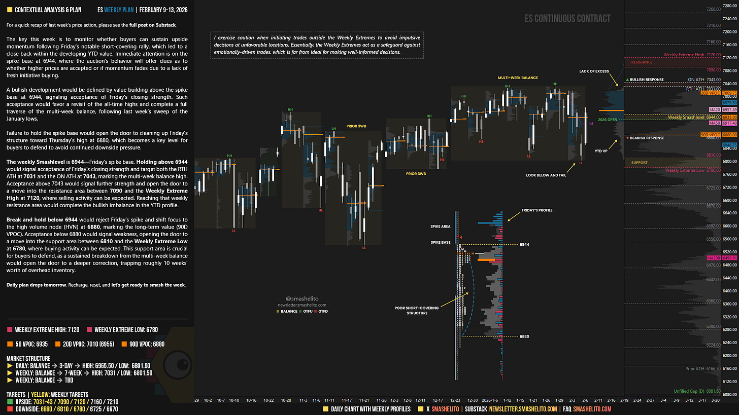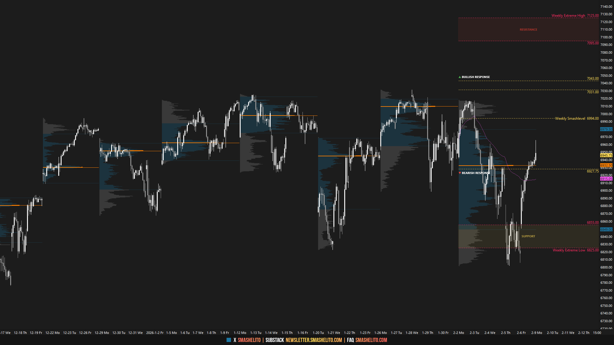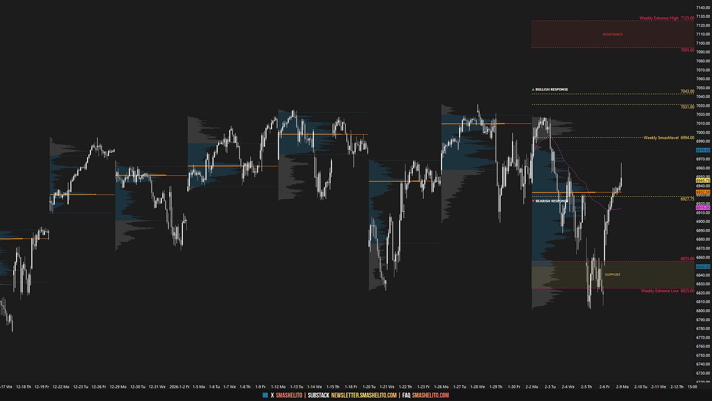 The weekly Smashlevel is 6944—Friday’s spike base. Holding above 6944 would signal acceptance of Friday’s closing strength and target both the RTH ATH at 7031 and the ON ATH at 7043, marking the multi-week balance high. Acceptance above 7043 would signal further strength and open the door to a move into the resistance area between 7090 and the Weekly Extreme High at 7120, where selling activity can be expected. Reaching that weekly resistance area would complete the bullish imbalance in the YTD profile.