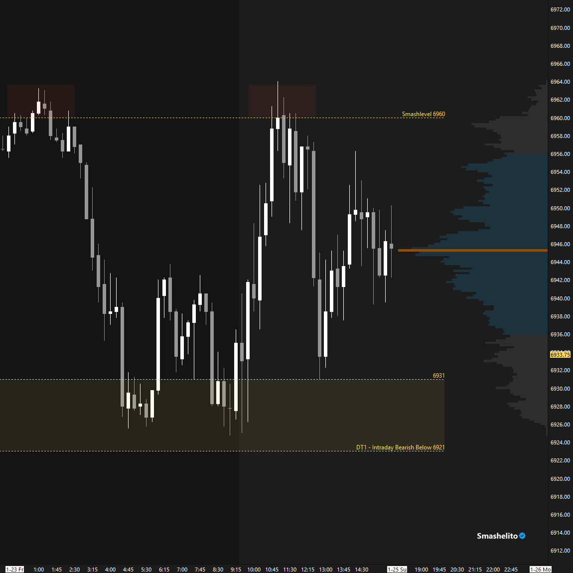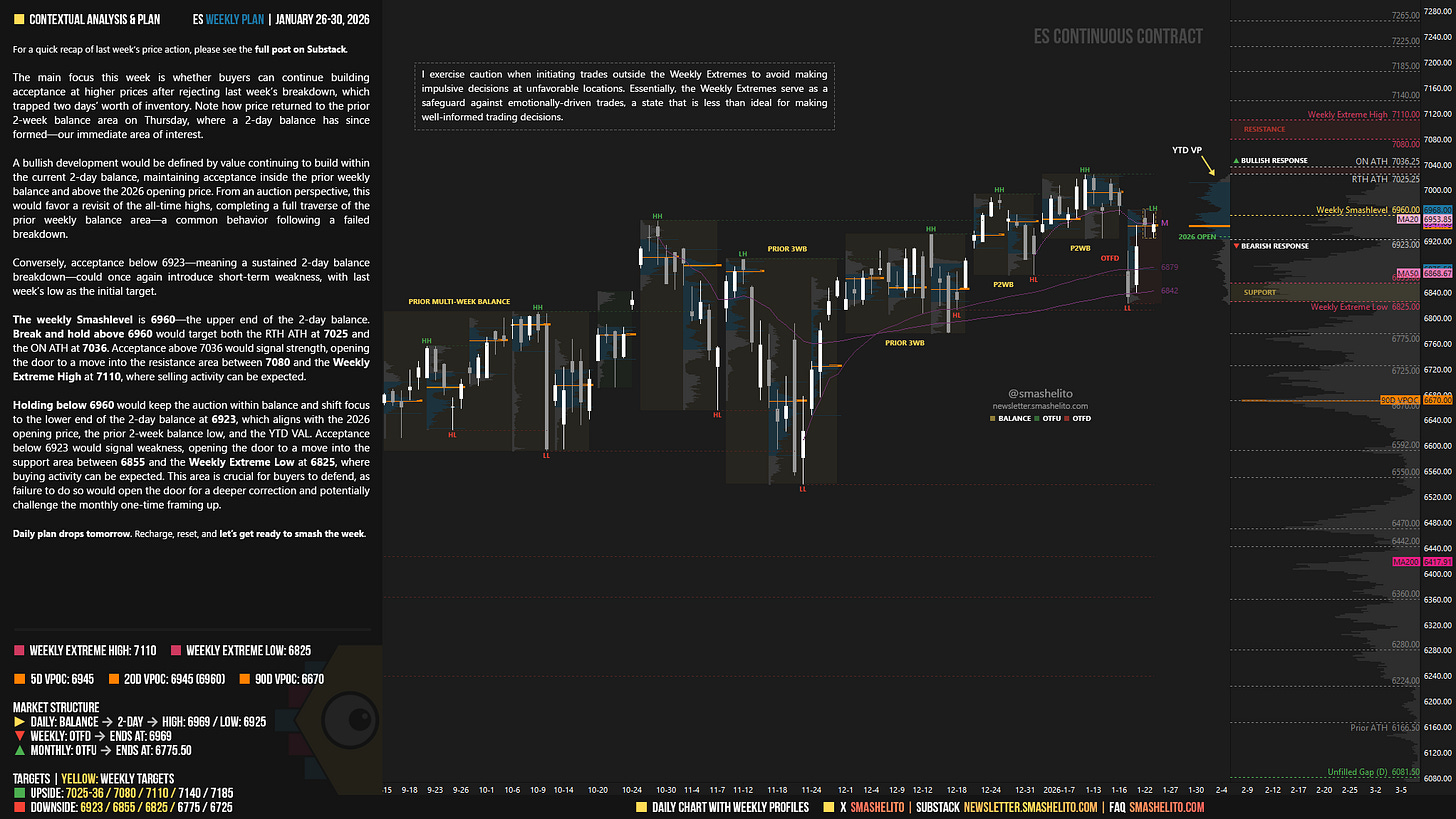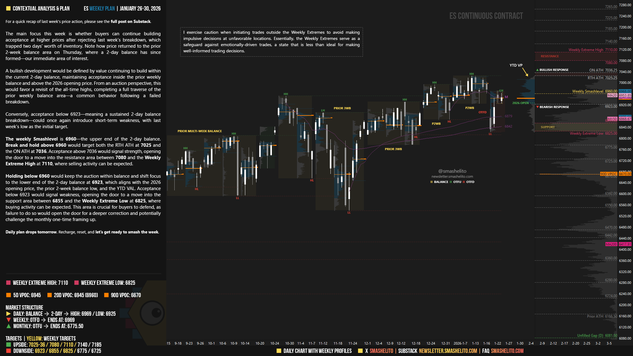 The weekly Smashlevel is 6960—the upper end of the 2-day balance. Break and hold above 6960 would target both the RTH ATH at 7025 and the ON ATH at 7036. Acceptance above 7036 would signal strength, opening the door to a move into the resistance area between 7080 and the Weekly Extreme High at 7110, where selling activity can be expected.