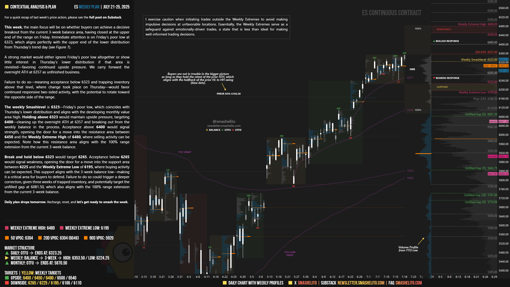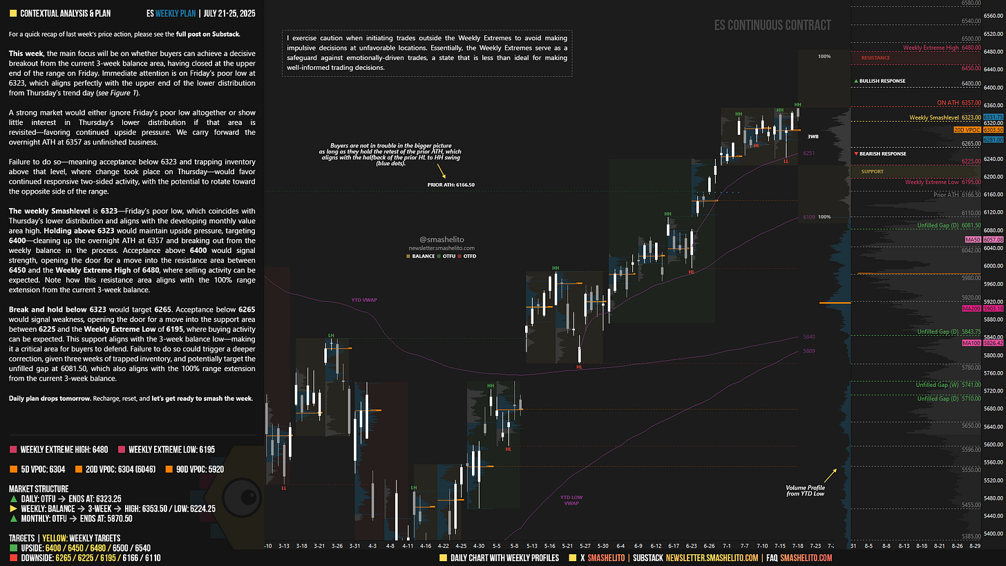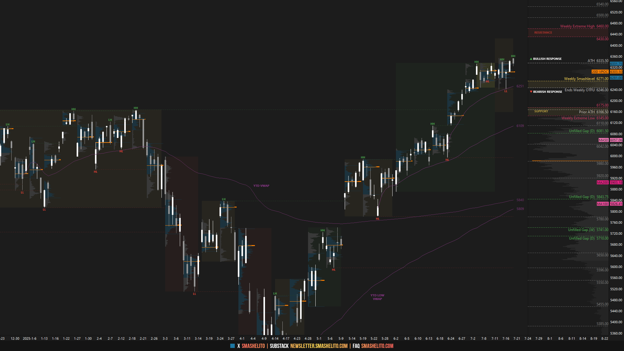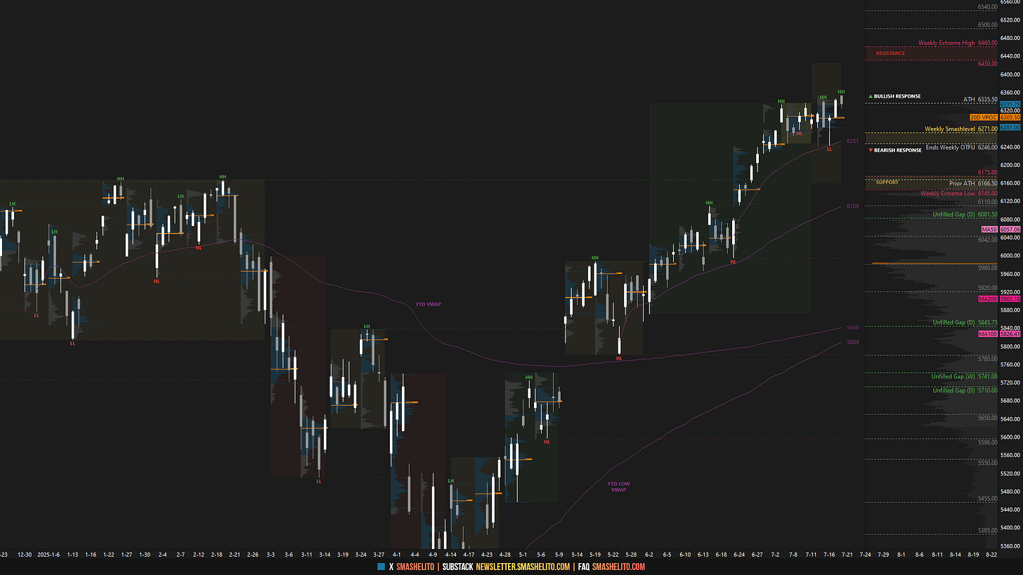 The weekly Smashlevel is 6323—Friday’s poor low, which coincides with Thursday’s lower distribution and aligns with the developing monthly value area high. Holding above 6323 would maintain upside pressure, targeting 6400—cleaning up the overnight ATH at 6357 and breaking out from the weekly balance in the process. Acceptance above 6400 would signal strength, opening the door for a move into the resistance area between 6450 and the Weekly Extreme High of 6480, where selling activity can be expected. Note how this resistance area aligns with the 100% range extension from the current 3-week balance.