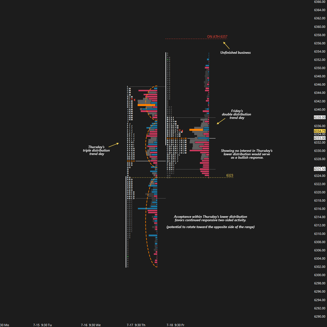 On Thursday, the market established a triple distribution trend day to the upside—marking another attempt to break out of the recent multi-day balance range. Heading into Friday, the key was to monitor for continuation—or lack thereof. Friday’s session, which printed a new all-time high overnight at 6357, ultimately failed to follow through, forming a double distribution profile to the downside. However, sellers were unable to fully negate Thursday’s trend day, as responsive buyers emerged at the upper end of Thursday’s lower distribution—a crucial area to monitor moving forward.