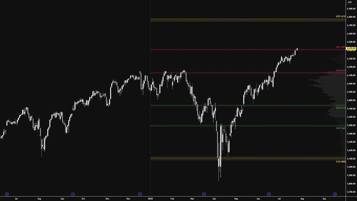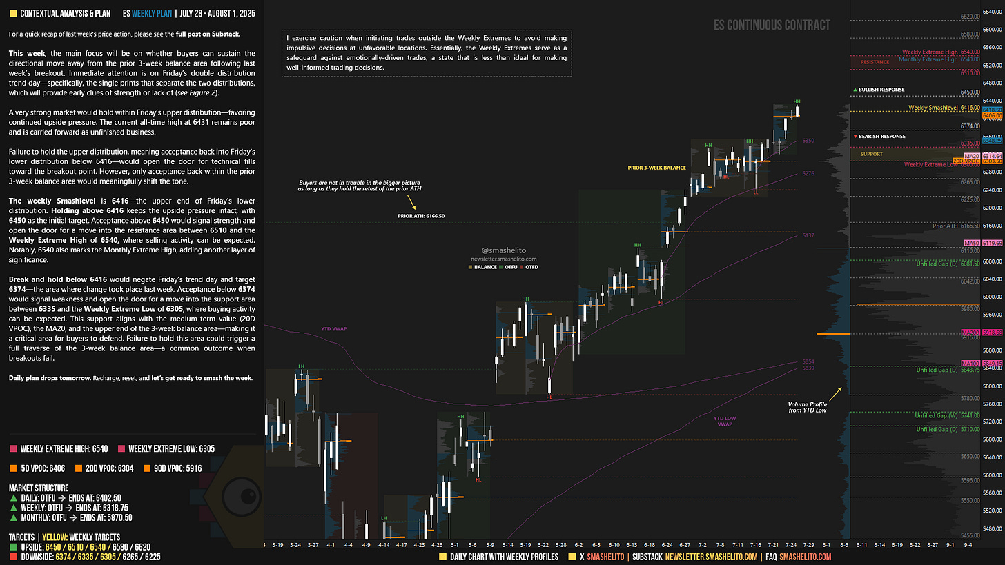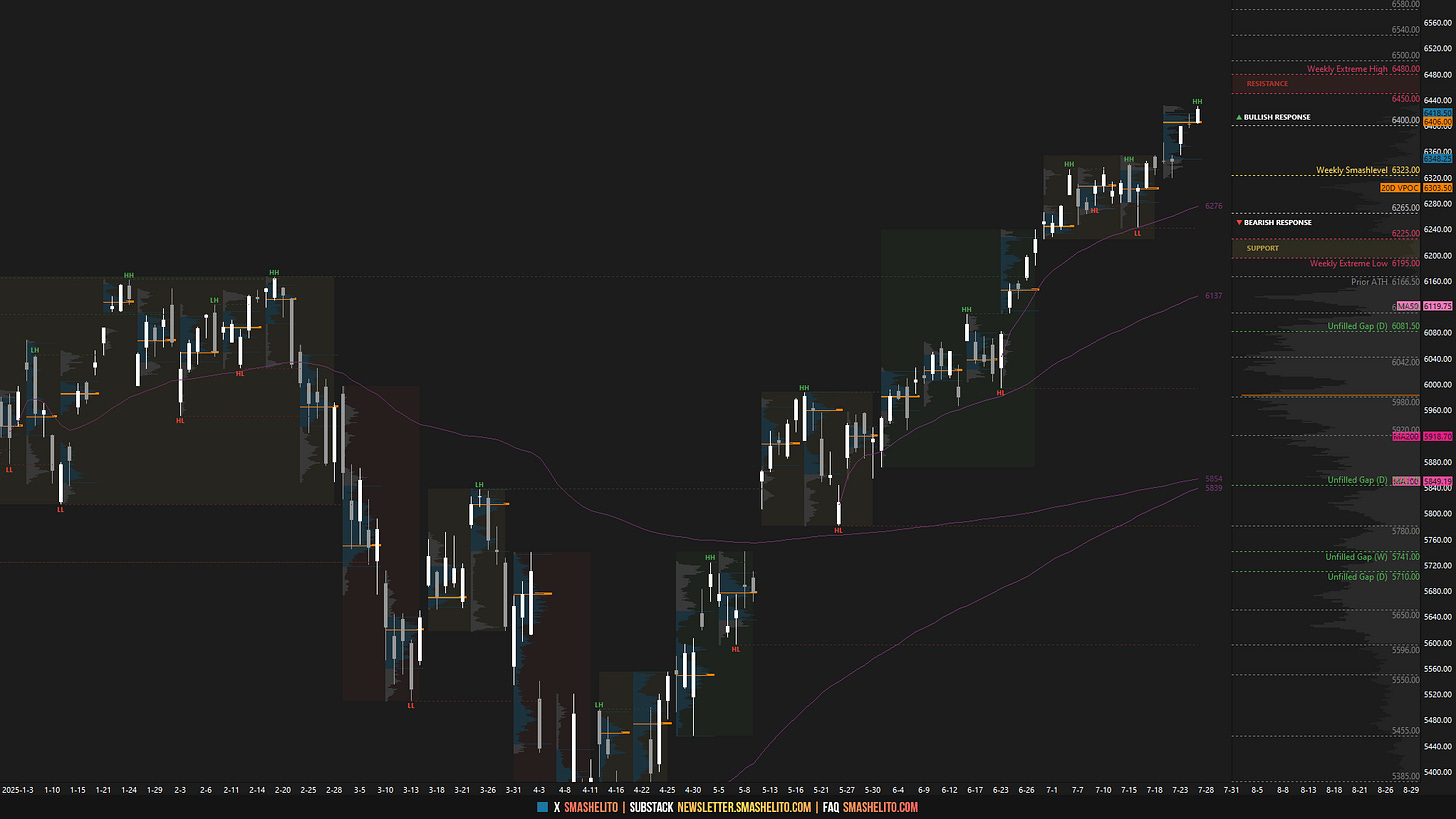 The weekly Smashlevel is 6416—the upper end of Friday’s lower distribution. Holding above 6416 keeps the upside pressure intact, with 6450 as the initial target. Acceptance above 6450 would signal strength and open the door for a move into the resistance area between 6510 and the Weekly Extreme High of 6540, where selling activity can be expected. Notably, 6540 also marks the Monthly Extreme High, adding another layer of significance.