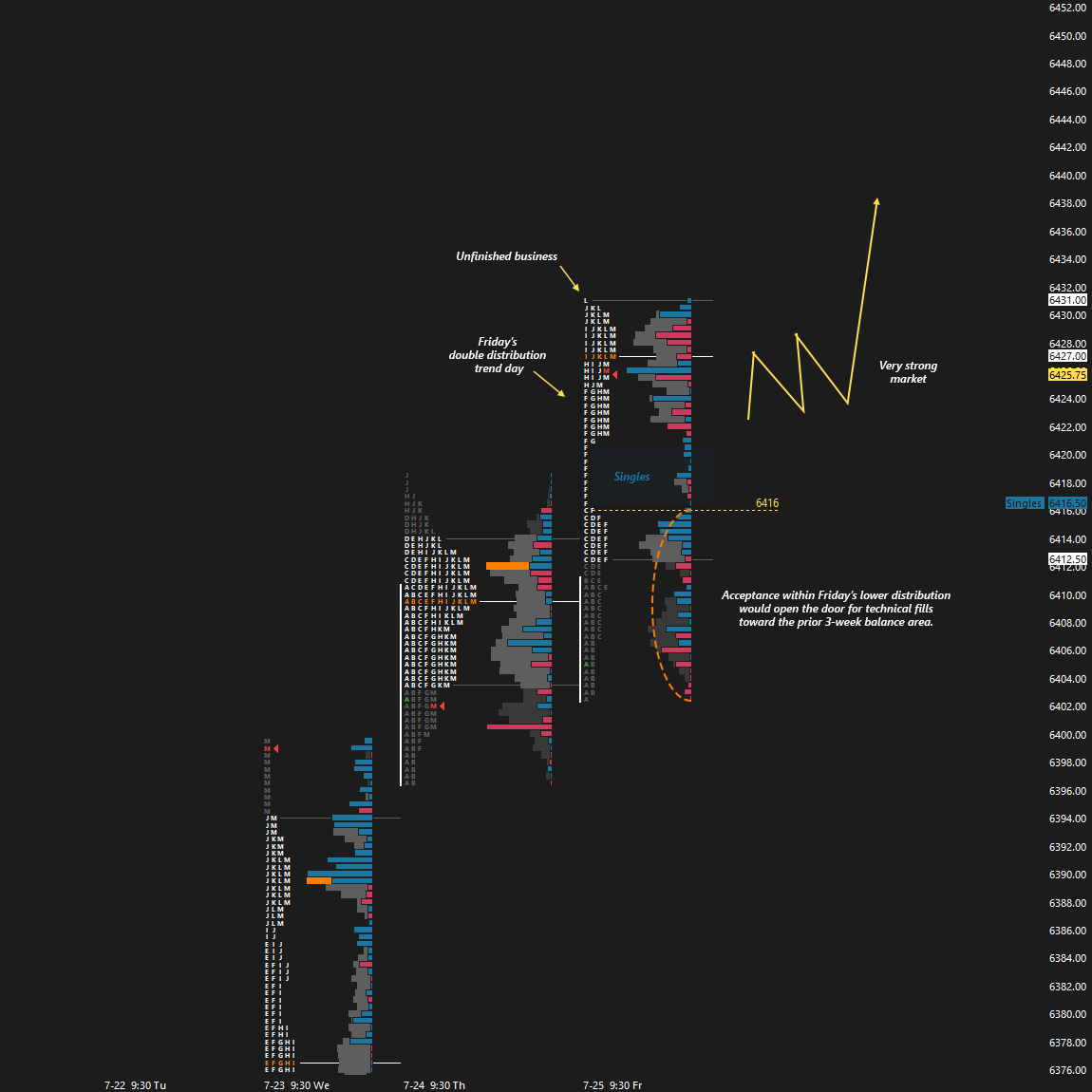 Break and hold below 6416 would negate Friday’s trend day and target 6374—the area where change took place last week. Acceptance below 6374 would signal weakness and open the door for a move into the support area between 6335 and the Weekly Extreme Low of 6305, where buying activity can be expected. This support aligns with the medium-term value (20D VPOC), the MA20, and the upper end of the 3-week balance area—making it a critical area for buyers to defend. Failure to hold this area could trigger a full traverse of the 3-week balance area—a common outcome when breakouts fail.