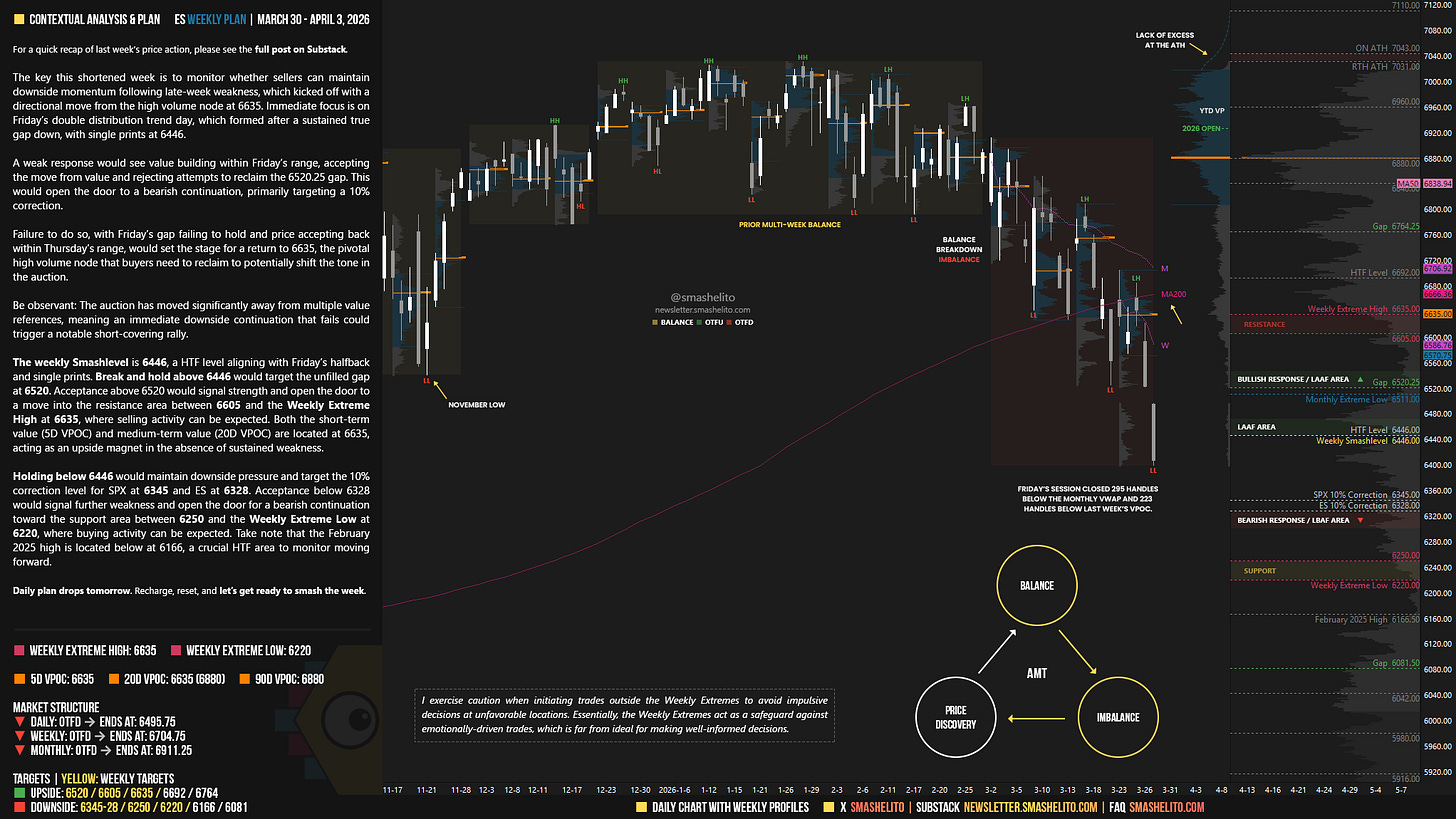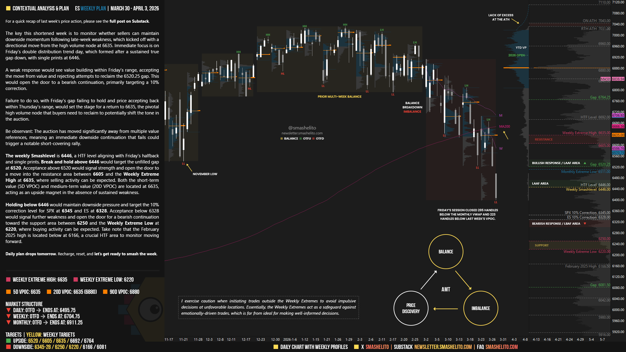 The weekly Smashlevel is 6446, a HTF level aligning with Friday’s halfback and single prints. Break and hold above 6446 would target the unfilled gap at 6520. Acceptance above 6520 would signal strength and open the door to a move into the resistance area between 6605 and the Weekly Extreme High at 6635, where selling activity can be expected. Both the short-term value (5D VPOC) and medium-term value (20D VPOC) are located at 6635, acting as an upside magnet in the absence of sustained weakness.