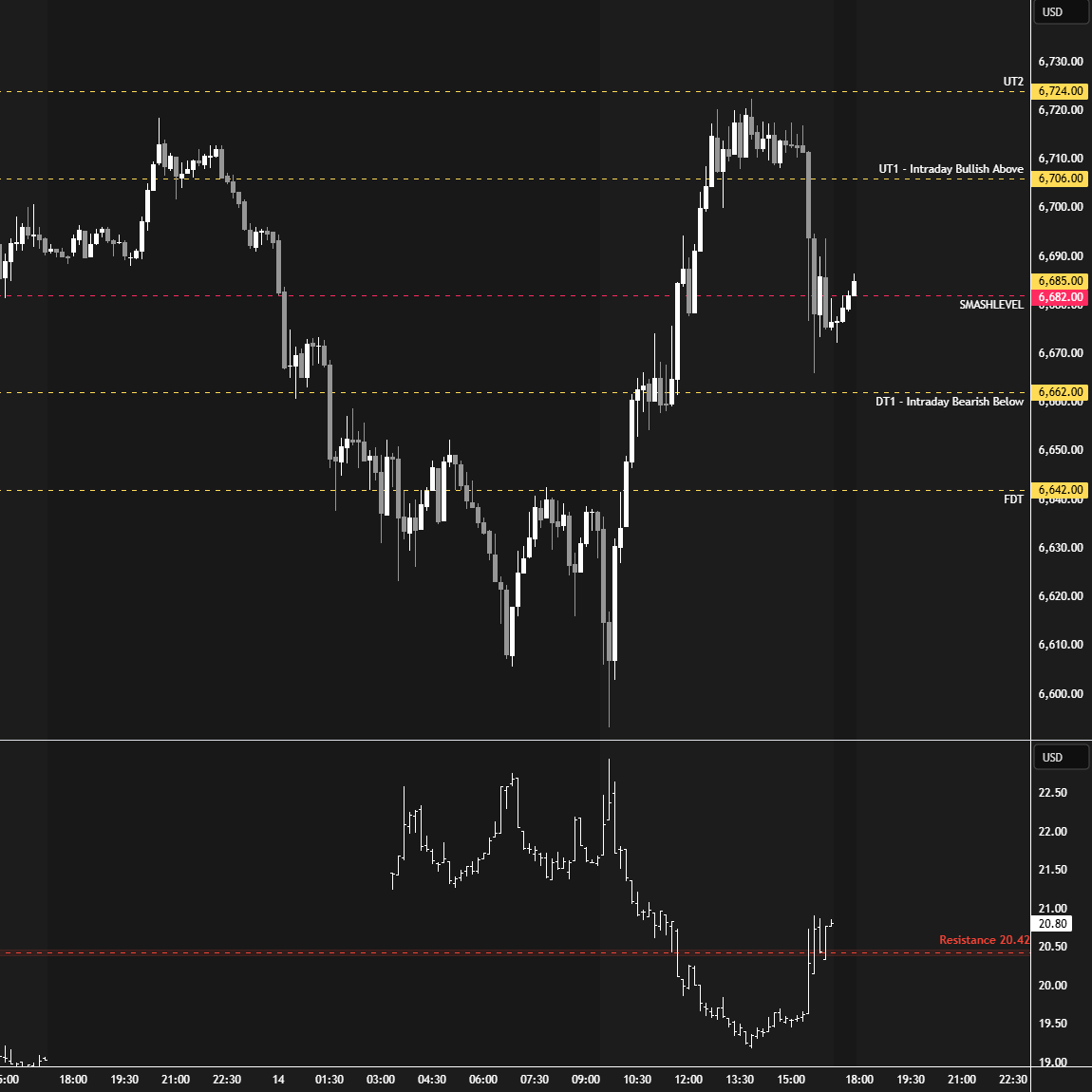 Buyers aim to build value above 6719, potentially setting the stage for a revisit of the all-time highs, while a weak response would involve building acceptance below 6660, opening the door to test the weak lows.