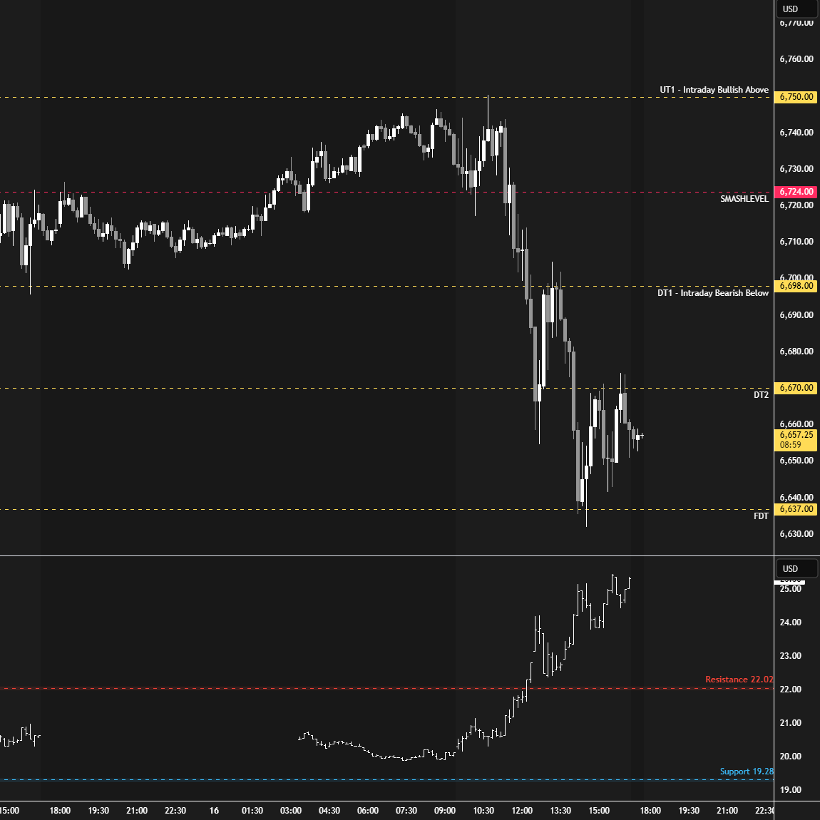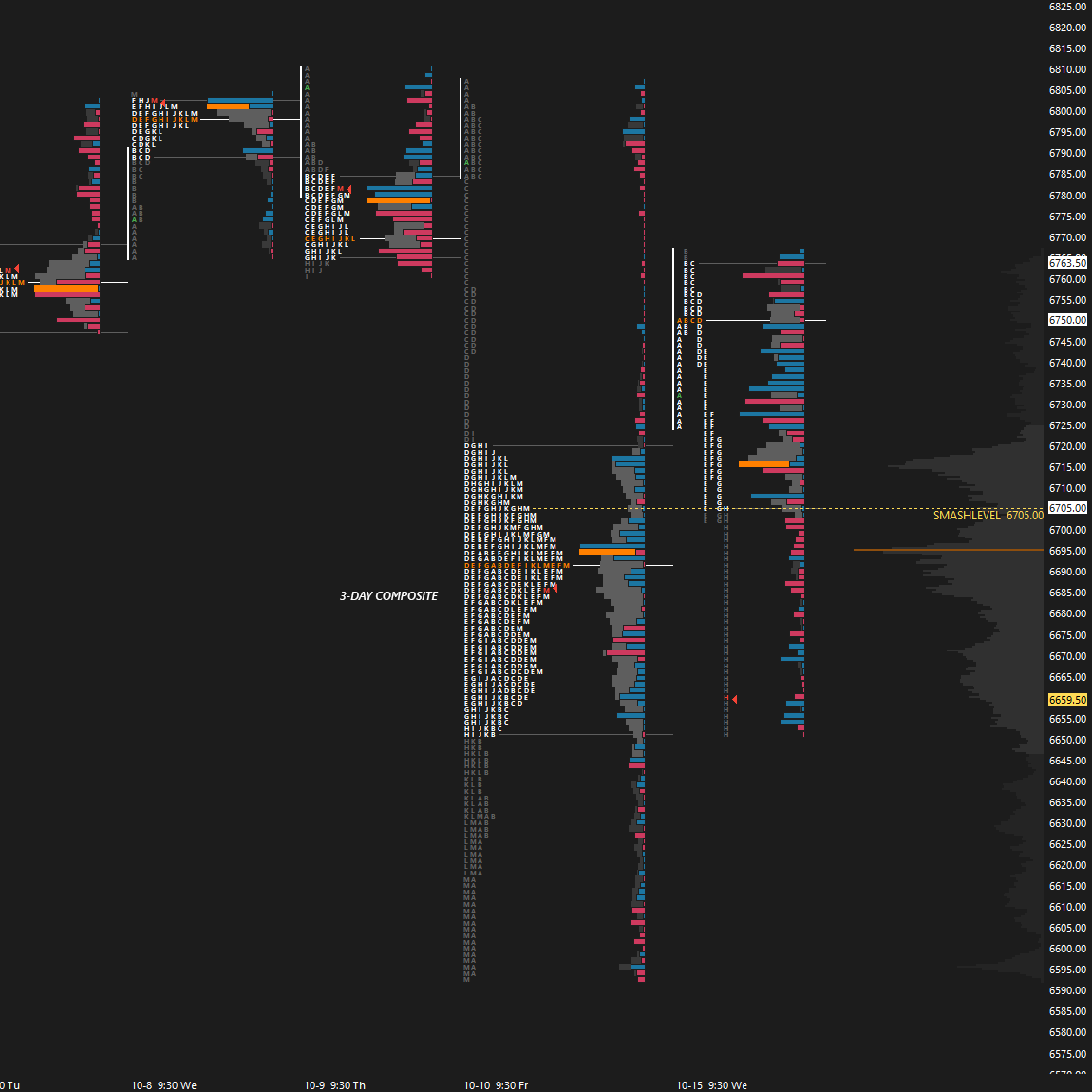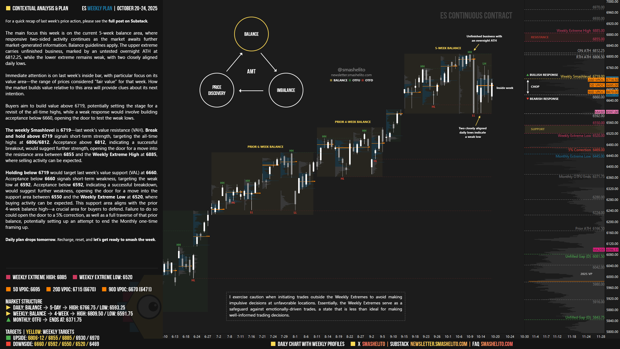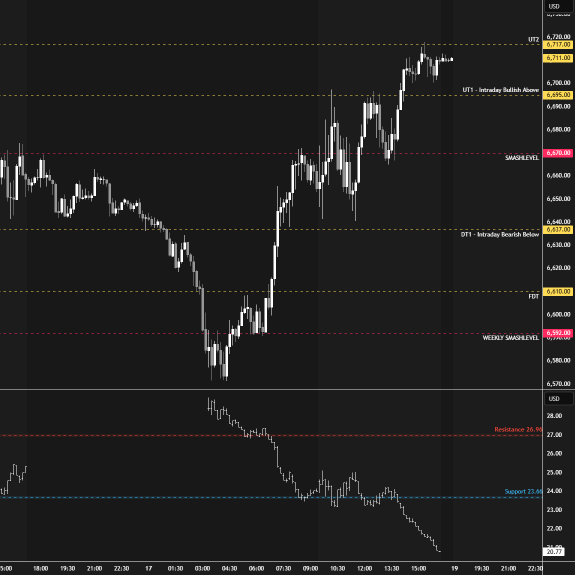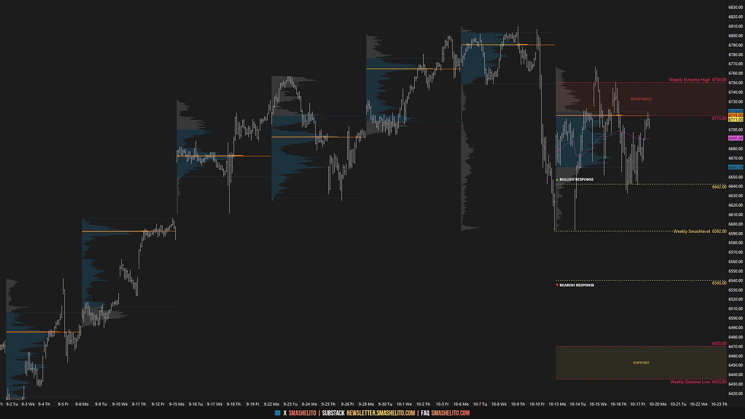 The weekly Smashlevel is 6719—last week’s value resistance (VAH). Break and hold above 6719 signals short-term strength, targeting the all-time highs at 6806/6812. Acceptance above 6812, indicating a successful breakout, would suggest further strength, opening the door for a move into the resistance area between 6855 and the Weekly Extreme High at 6885, where selling activity can be expected.