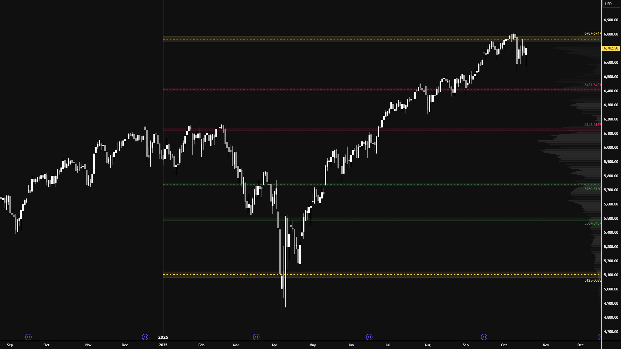 Price continues to attract selling activity in the 6747–6787 area of interest. As discussed last week, the key takeaway was that the closer we got to this area, the less interested I was in initiating long-side swing trades. Waiting patiently for pullbacks to 6421–6401, or even 6142–6122, remains the more reasonable approach. It remains to be seen where the market will go next.