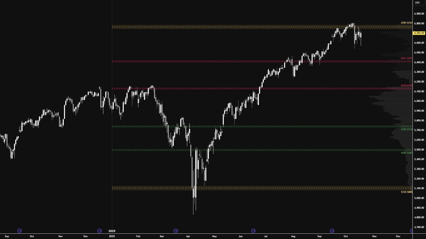 Holding below 6719 would target last week’s value support (VAL) at 6660. Acceptance below 6660 signals short-term weakness, targeting the weak low at 6592. Acceptance below 6592, indicating a successful breakdown, would suggest further weakness, opening the door for a move into the support area between 6550 and the Weekly Extreme Low at 6520, where buying activity can be expected. This support area aligns with the prior 4-week balance high—a crucial area for buyers to defend. Failure to do so could open the door to a 5% correction, as well as a full traverse of that prior balance, potentially setting up an attempt to end the Monthly one-time framing up.
