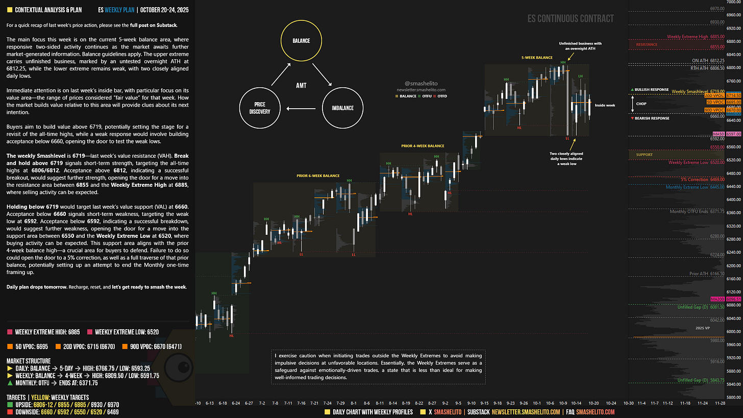 The main focus this week is on the current 5-week balance area, where responsive two-sided activity continues as the market awaits further market-generated information. Balance guidelines apply. The upper extreme carries unfinished business, marked by an untested overnight ATH at 6812.25, while the lower extreme remains weak, with two closely aligned daily lows.