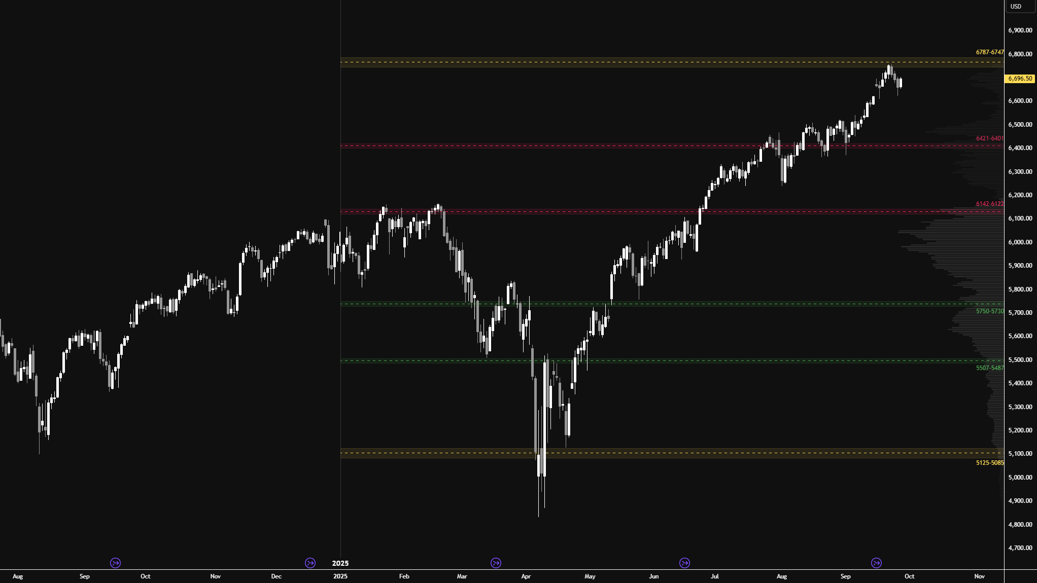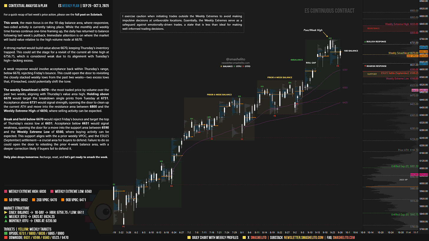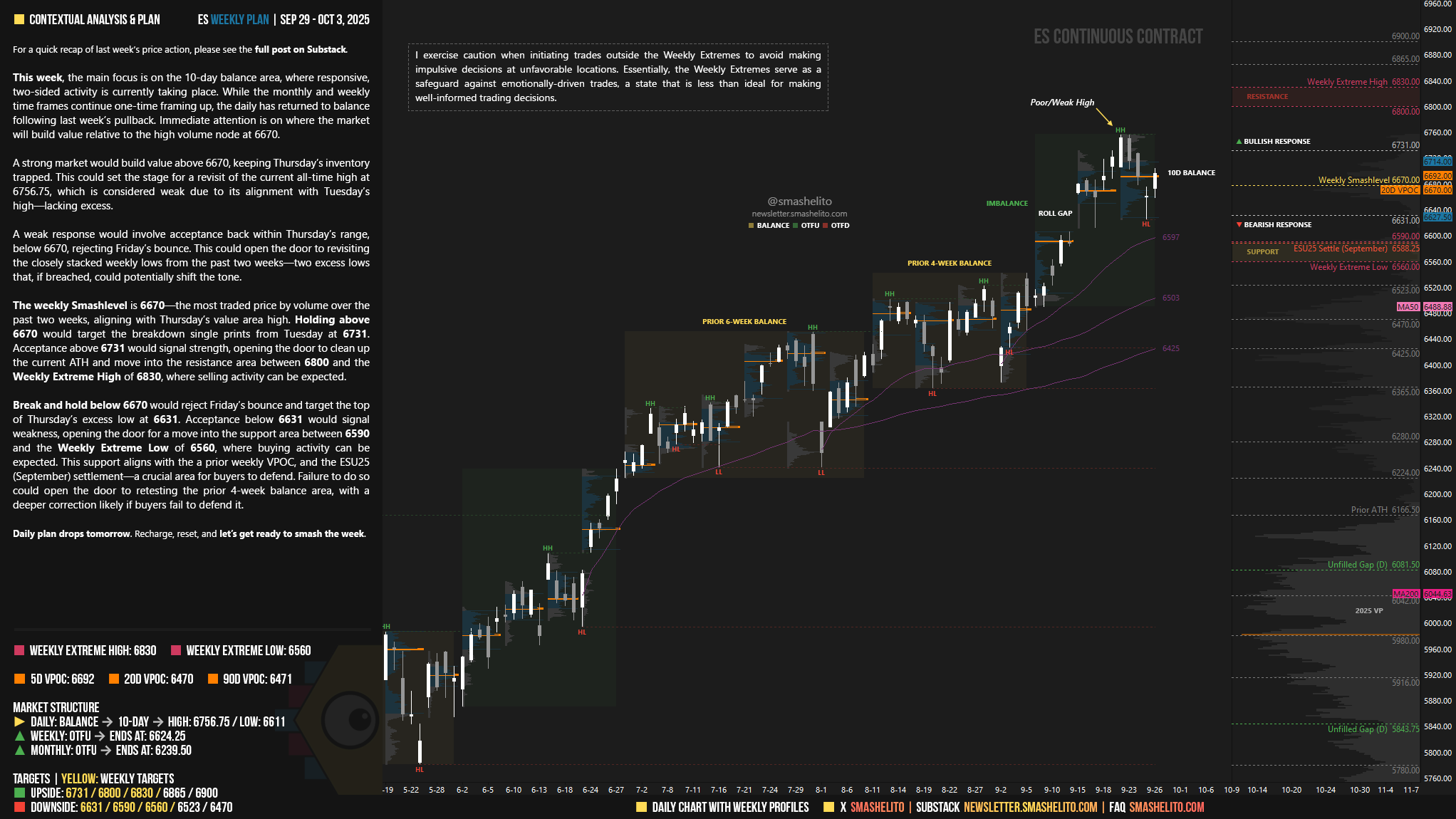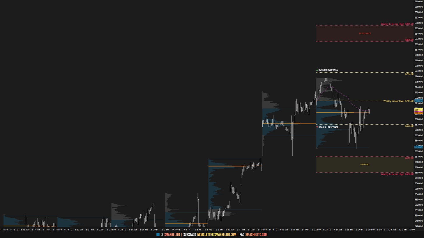 The weekly Smashlevel is 6670—the most traded price by volume over the past two weeks, aligning with Thursday’s value area high. Holding above 6670 would target the breakdown single prints from Tuesday at 6731. Acceptance above 6731 would signal strength, opening the door to clean up the current ATH and move into the resistance area between 6800 and the Weekly Extreme High of 6830, where selling activity can be expected.