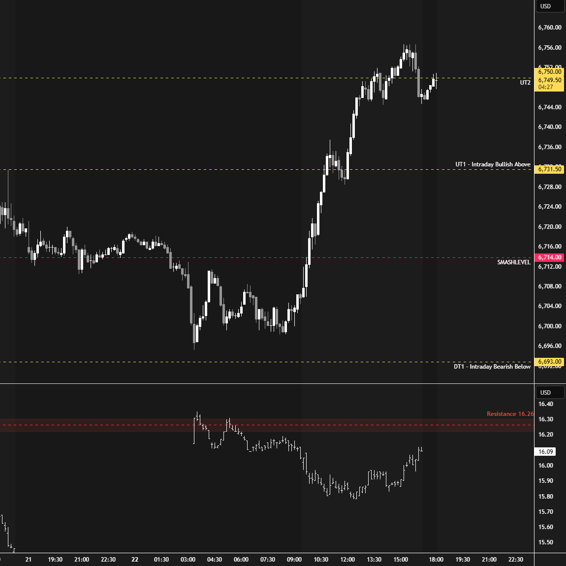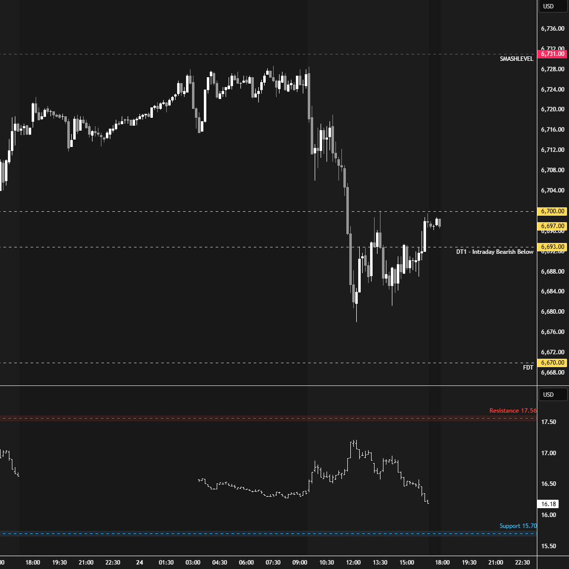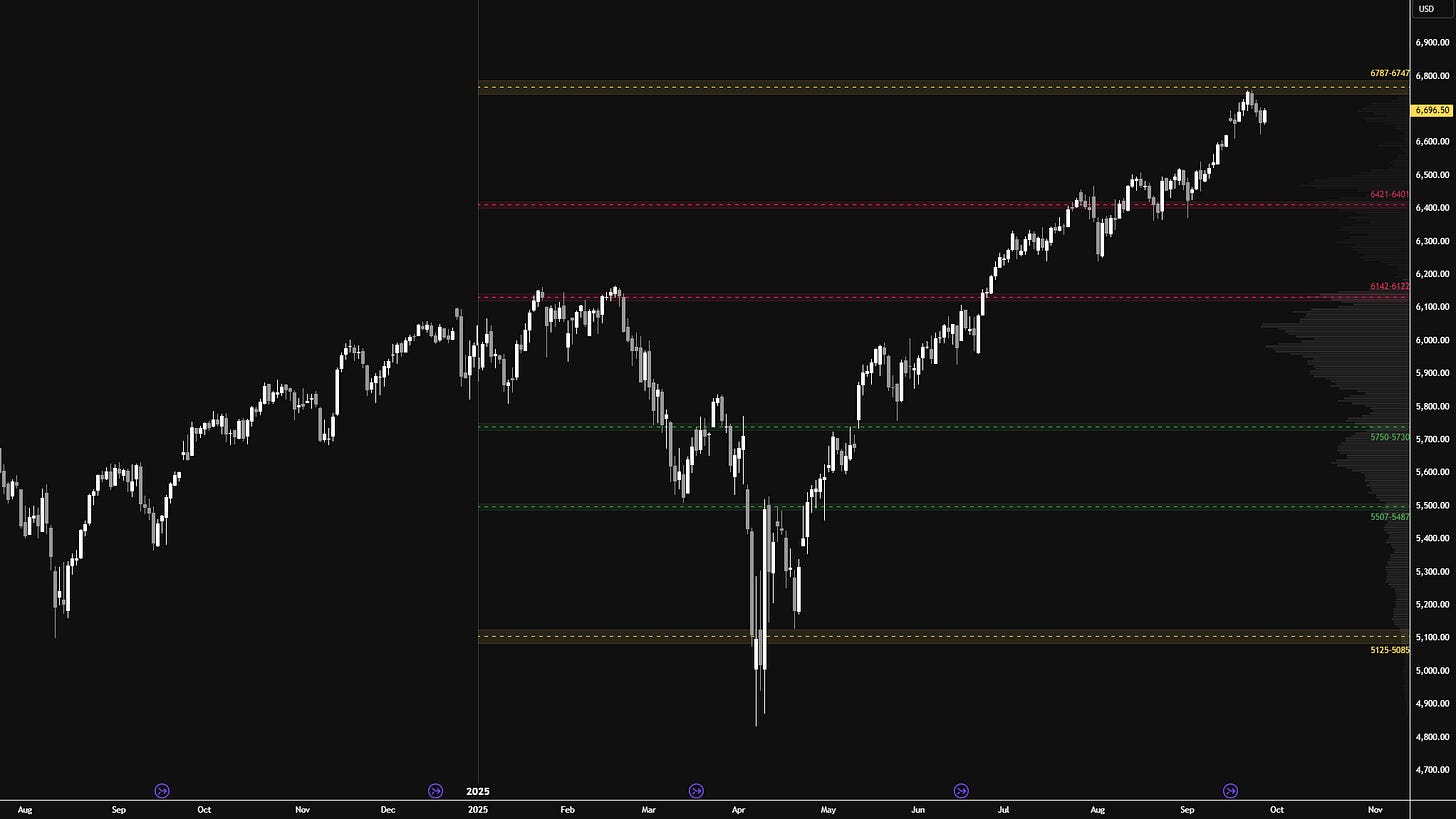 The weekly Smashlevel is 6670—the most traded price by volume over the past two weeks, aligning with Thursday’s value area high. Holding above 6670 would target the breakdown single prints from Tuesday at 6731. Acceptance above 6731 would signal strength, opening the door to clean up the current ATH and move into the resistance area between 6800 and the Weekly Extreme High of 6830, where selling activity can be expected.