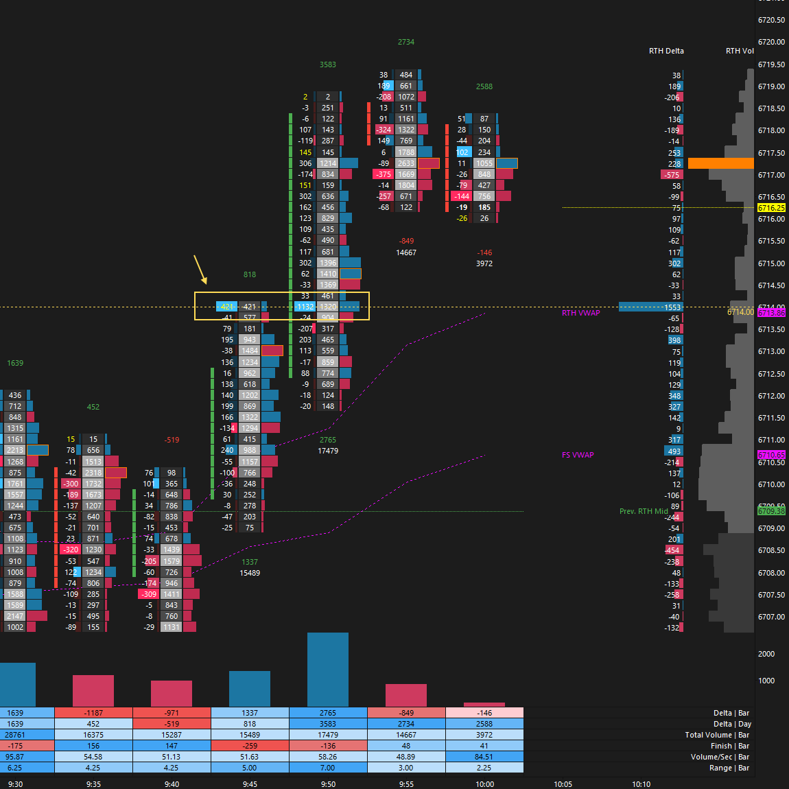 Sellers successfully defended 6706 overnight, resulting in a downside continuation in the RTH session, which opened on a true gap down. Last week’s value area was traversed in the process; however, buyers managed to close the session back above last week’s VAL. The gap at 6678 remained unfilled—our main focus heading into Friday’s session.