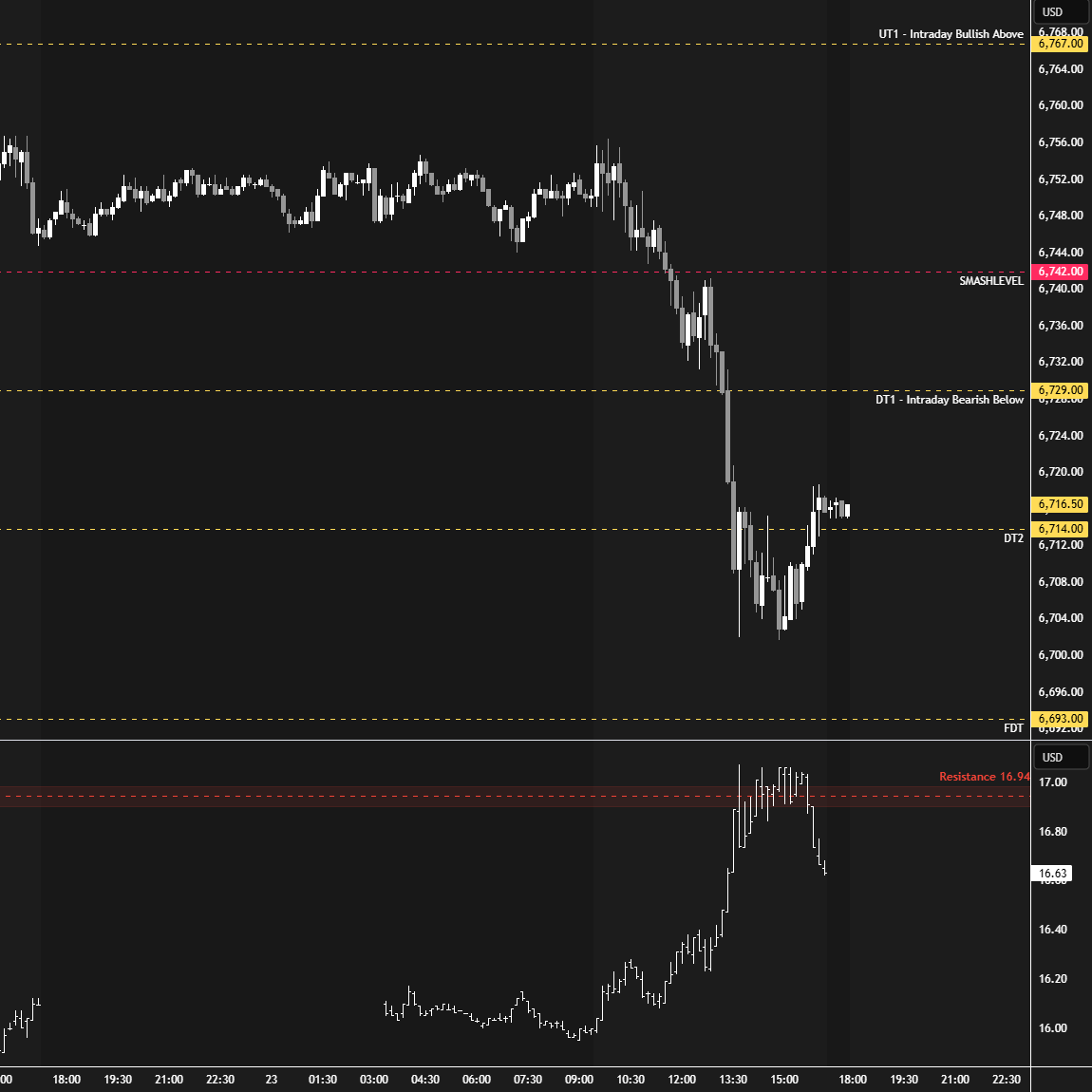 Tuesday’s session established a weak high against Monday’s, after which selling pressure emerged, ultimately retracing Monday’s gains and forming a triple distribution trend day to the downside. Heading into Wednesday, the key question was whether this weakness was simply weak-handed longs getting flushed or driven by stronger sellers. The weak-high formation earlier in the session suggested the former. Further weakness was possible if sellers could defend last week’s high at 6731.